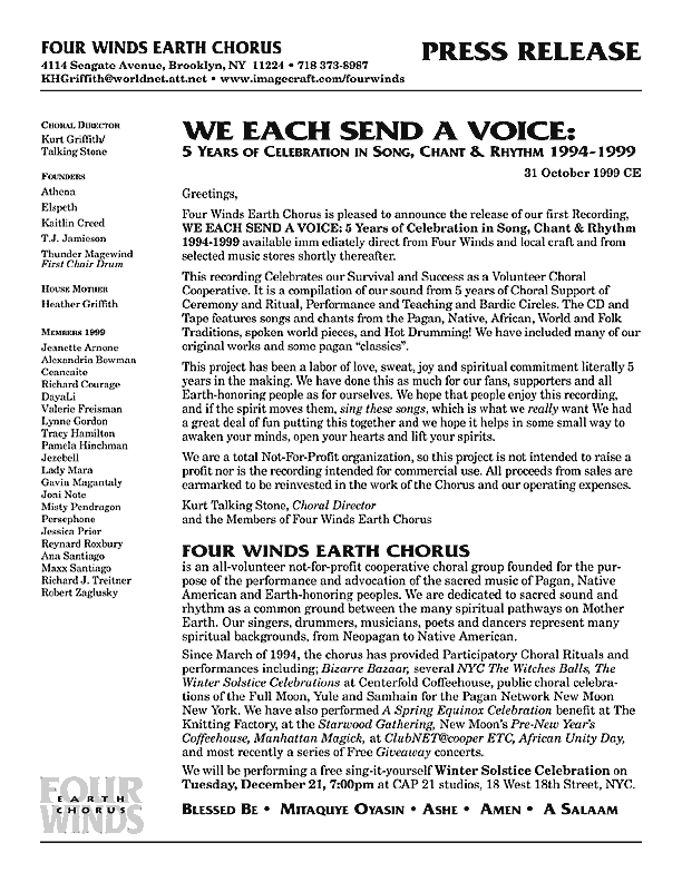 View the November 5th News page, We each Send A Voice, Press Release, Witches Ball, Winter Solstice