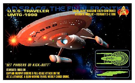 Poster / Travel Agent Magazine Sales Meeting, 1998 Art Direction, Graphic Design, 3D Modeling & Digital Illustratiion Created as part of the inspirational materials created for Travel Agent Magazine's annual sales meeting. This edition featured a Classic Star Trek Theme, My department created consoles, props, wall graphics, banners, sideshows and presentation packages. The Sales Force found a Florida hotel with a futuristic conference center and took the place over for an intense weekend, including Starfleet costumes. Infini-D(logomotion), Photoshop, Quark Xpress With apologies to Gene Roddenberry and Paramount Pictures. I'm fairly certain that we stretched the concept of fair use more than a bit. But we had a lot of fun putting this together. |