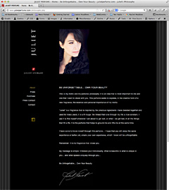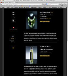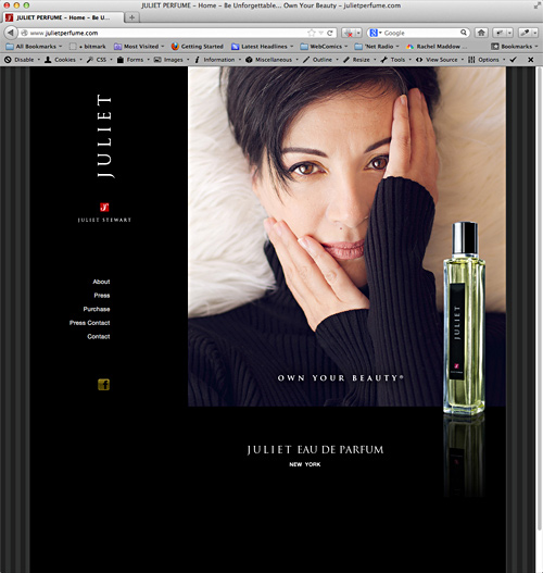 JULIET Perfume by Juliet Stewart Top: Home Page. Bottom: Philosophy Page, Online Store. Juliet Stewart expanded beyond makeup to relase a stunningly delicious perfume. We cereated a siter site for the perfume, extending the branding and overall look of the main site. The site site was updated and revised for the fragrance’s debit at Elements Showcase in January 2013. Coded in PHP for swift modular updates, incorporating CSS3, HTML4-5, Facebook and PayPal shopping cart. Web Design and Administration. Dreamweaver, Textwrangler, Photoshop, Acrobat, inDesign |