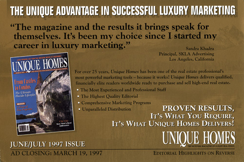 Promotional Postcard to promote advertising and luxury real estate listings in the June/July 1997 issue of Unique Homes Magazine. Postcard features a striking metallic gold duotone background using metallic PMS inks. Logo Design by Steven Powell. Ed Hanasik,