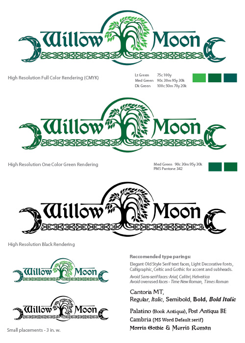 Willow Moon Logo Logo design prepared for self-employed craft artist. Logo based on celtic designs, assembeled as vector artwork in Illustrator. Supplied in Full Color, One Color, and Black versions, in multiple commor formats in print and screen resolution. Adobe Illustrator, Photoshop, InDesign, Acrobat |
